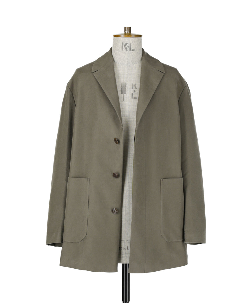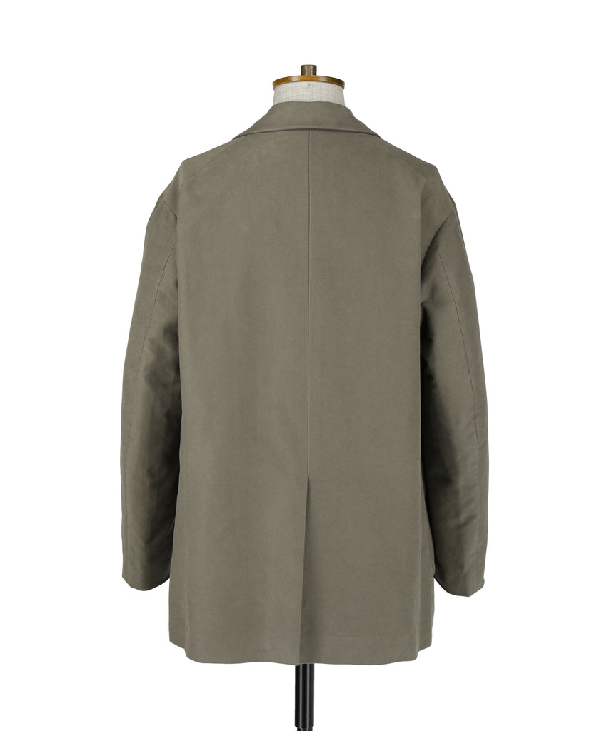 縦糸に30 番単糸(30/1)、横糸に20 番単糸(20/1)を使用して織り上げたコットンモールスキン素材。横繻子組織特有の微光沢感があり、上品な表情を持っています。表面に施されたサーバス起毛(スエード起毛のシャーリングを地の組織が見えるまで刈り込んだ仕上げ)により、独特の柔らかさと滑らかな肌触りが生まれています。この仕上げが素材に深みのある風合いを与え、着心地の良さを高めています。 腰からヒップラインをカバーするハーフ丈のデザインが、軽快さと防寒性を兼ね備え、幅広いスタイリングに対応します。
